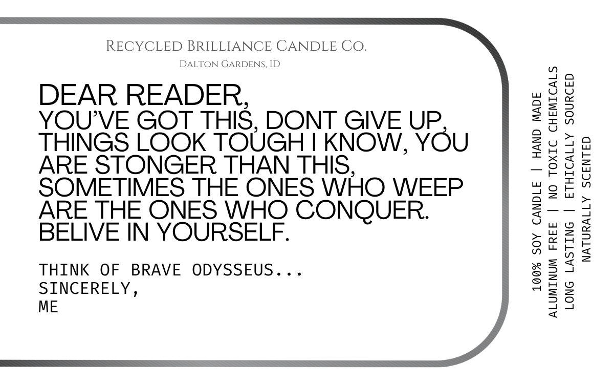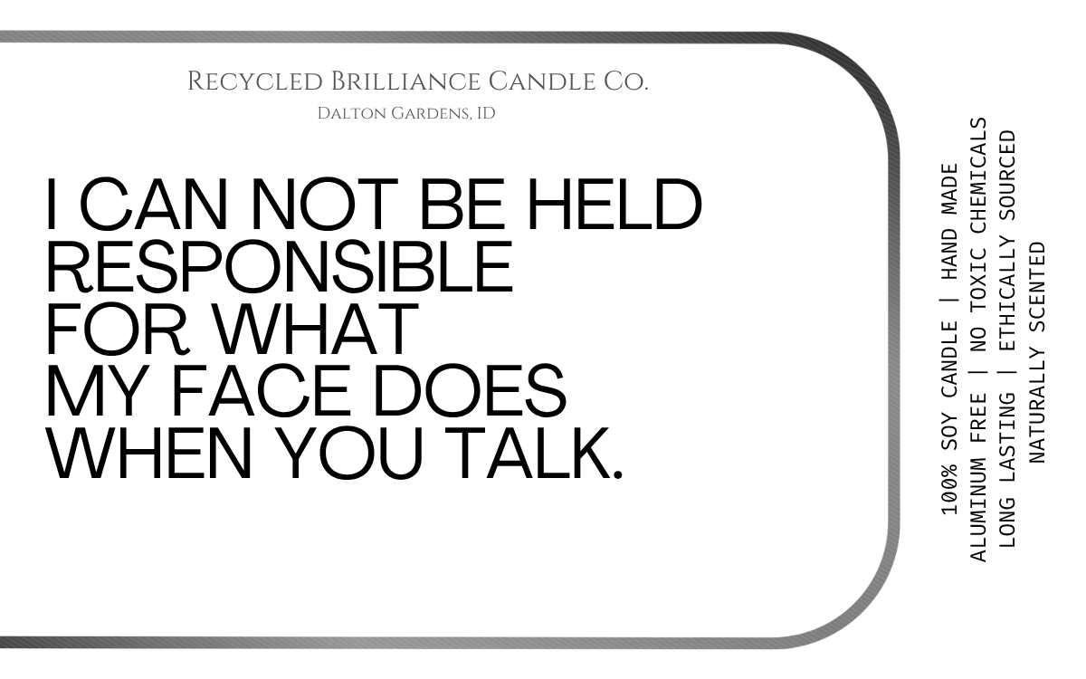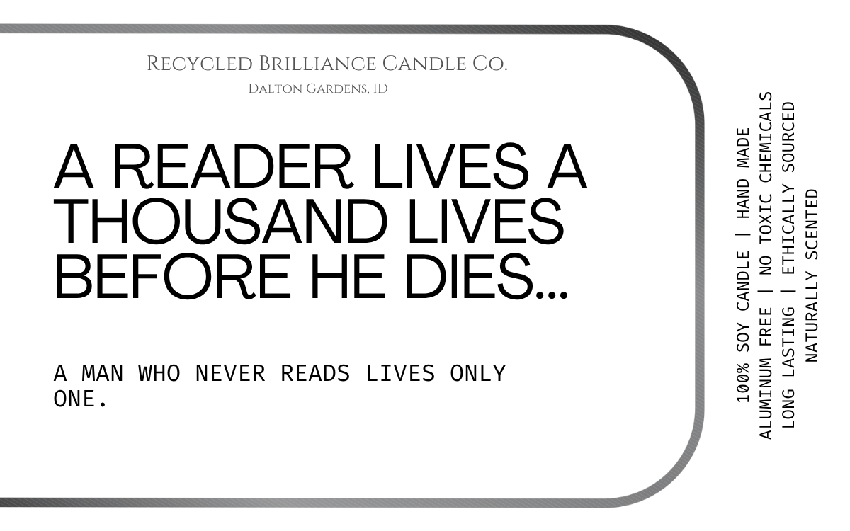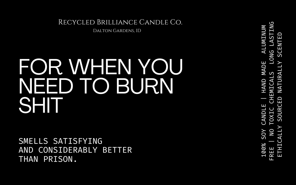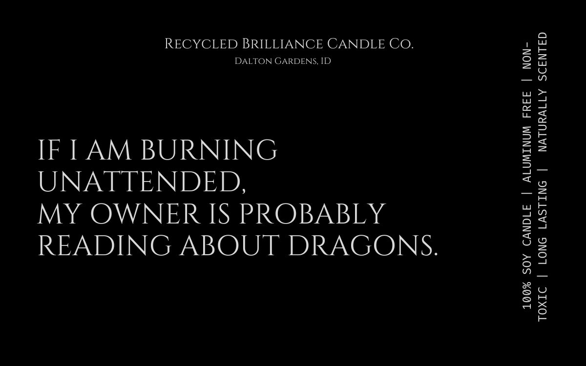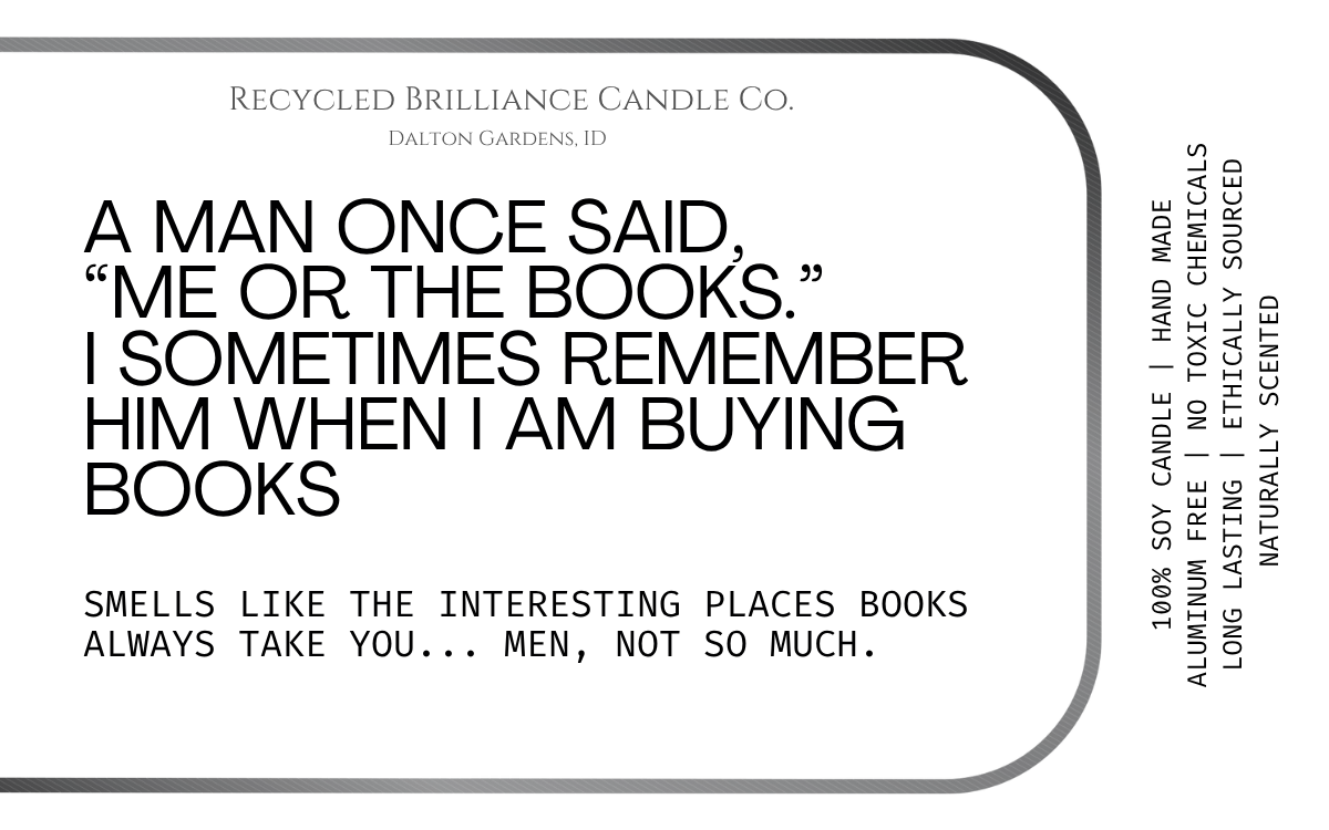 If you have seen us at a show, or just came across us online, you should know that your health is number one, and humor is our style. Our candles each come in your own customized label, either featuring a quote from you favorite book, or one of our fun sarcastic humor quotes. If you have one of your own, we are happy to bring your creation to life!